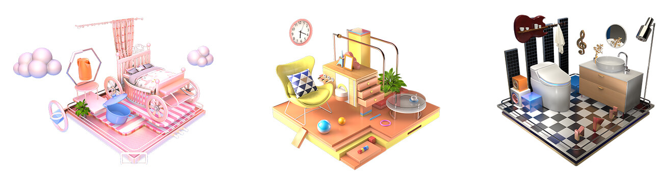 建模创意,用魔方的造型旋转变换切换3个场景。